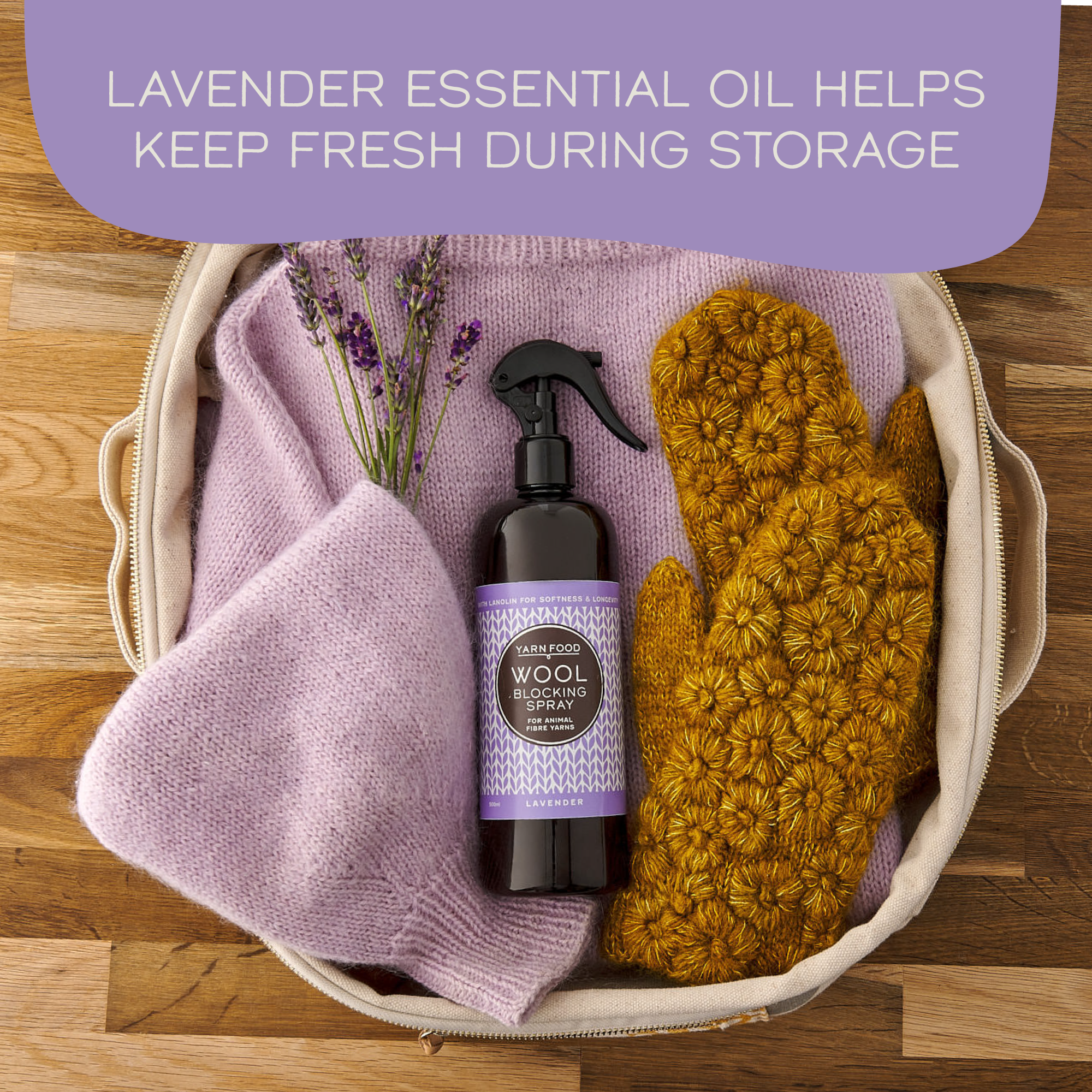 Yarn Food's Blocking Spray for Wool & Animal Fibre Yarns is expertly designed for yarn crafters to nourish and preserve wool- and animal fibre yarns such as merino, cashmere, mohair, alpaca, angora, camel and their blends during the spray blocking process.